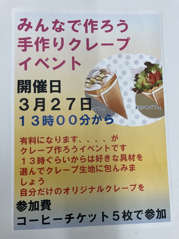 3月27日、有料イベントになりますがクレープを作って好きな具材を包んでいただこうかと思います。